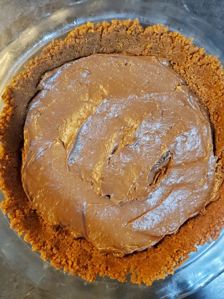 - Adding the pudding into the crust, covering, and chilling